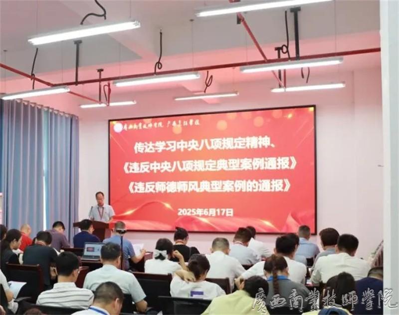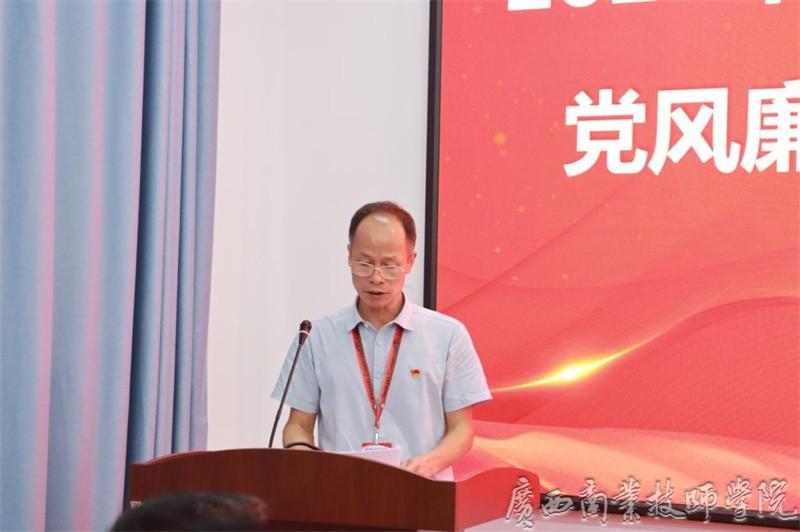 随后,党委副书记、纪委书记、学院副院长何水荣传达学习了中央八项规定及中央八项规定实施细则,通报违反中央八项规定典型案例及违反师德师风典型案例,通过案例分析,警示全体党员同志要时刻绷紧纪律规矩这根弦,做到知敬畏、存戒惧、守底线。